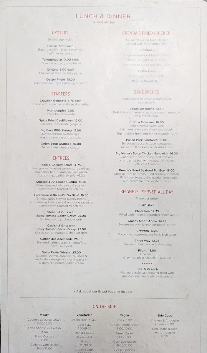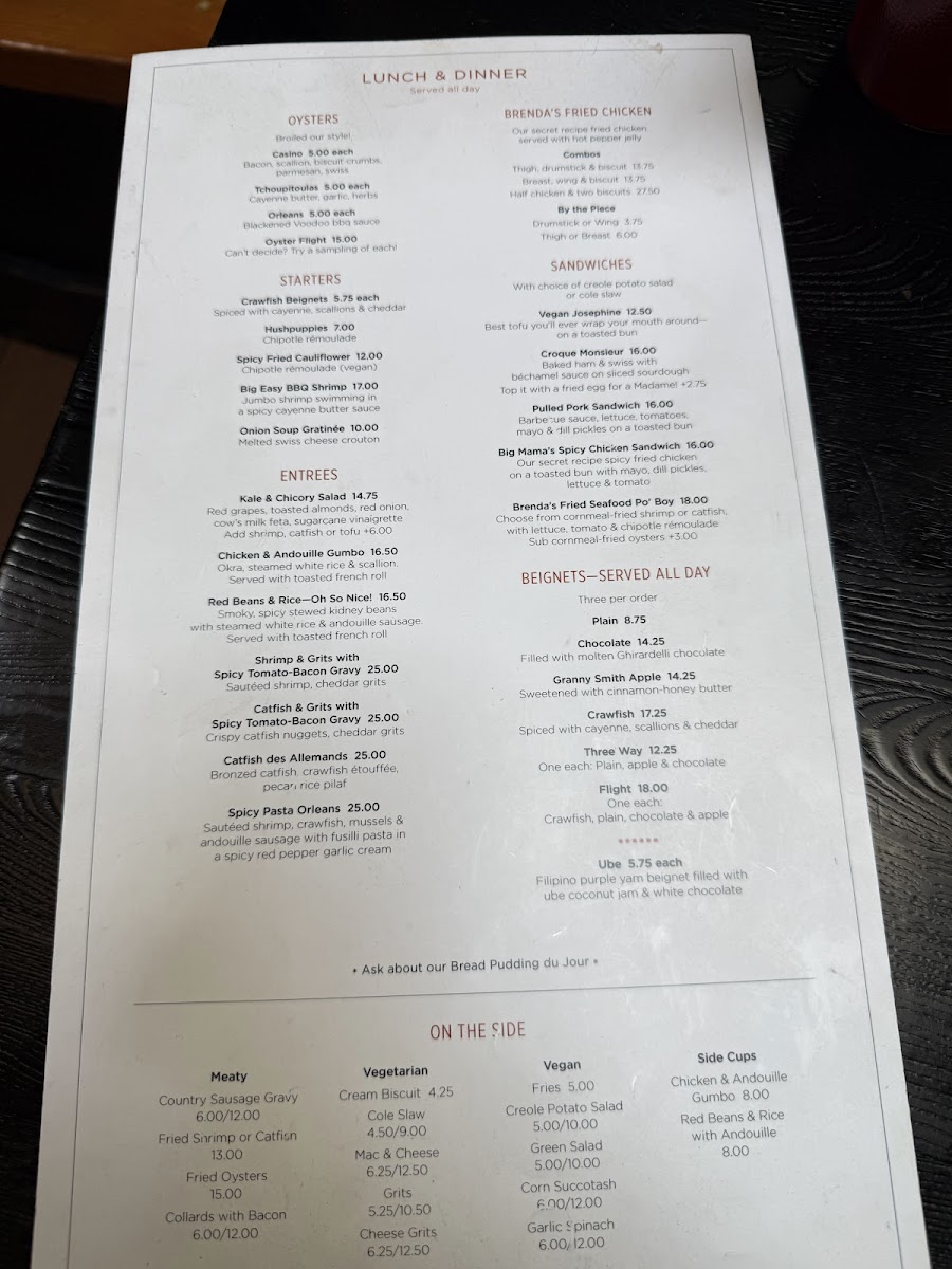 “ Honestly this place is perfect. I feel like it’s just the right size and that they’ve truly perfected the service speed, style,portions and recipes. I’d almost not want to see them expand it because they do it so well currently. You know how like when you double a recipe sometimes it doesn’t come out quite right (or that could be just me ). Anyways I got the sampler platter which looking back at the menu looks more like it could’ve been the daily special and not always on the menu. The greens were good solid greens like just classic that you could eat continuously. The red beans and rice were definitely a hit my mom and aunt both make them like that. The gumbo is the most authentic gumbo I’ve had outside of my uncles. What do I mean by that? Normally if it has not been made by my uncle (from a line of Prudhommes out of Louisiana I think) the gumbos on the menus I’ve had are usually just a pretty good soup. Theres always something just off about them but this gumbo was heart warming and I could only imagine what the deluxe version tastes like. If I had more time here I would’ve tried it! My husband had the catfish de allemands and I think he said something along the lines of my God almighty when he tried it haha . Safe to say he loved it. It was pretty good. Honestly we were both thrown off by the pecans in the rice but they were good but I’d never have them anywhere else. Only at Brenda’s now can you pecans in my rice I guess. Ok let’s talk about the pillow soft hot beignet that I will dream about as we make our way back to the east coast. Wow it was probably the best no I’m sure thee absolute best one I’ve ever had. I think that’s what princess Tiana’s must have been based off of for sure because they truly were amazing. Overall the staff was friendly and efficient. They were not playing no games with us. If the came over and we weren’t ready they weren’t wasting no time. They quickly said “we’ll give you a few more minutes” and I appreciated that because they were just so many good things to bounce between hence why I got a sampler. But again we didn’t feel rushed or pushed off or like anyone was rude. Everything was efficient well done and felt like a well oiled machine. I hope to make it back one day! ”